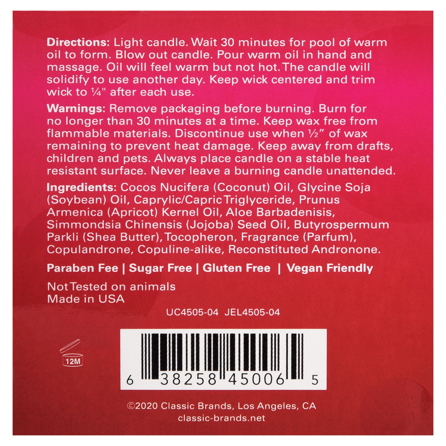 Directions: Light candle. Wait 30 minutes for pool of warm oil to form. Blow out candle. Pour warm oil in hand and massage. Oil will feel warm but not hot. The candle will solidify to use another day. Keep wick centered and trim wick to 1/4" after each use.